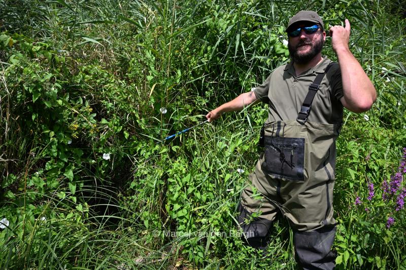 De geinterviewde toont een ingang van een bevergang.