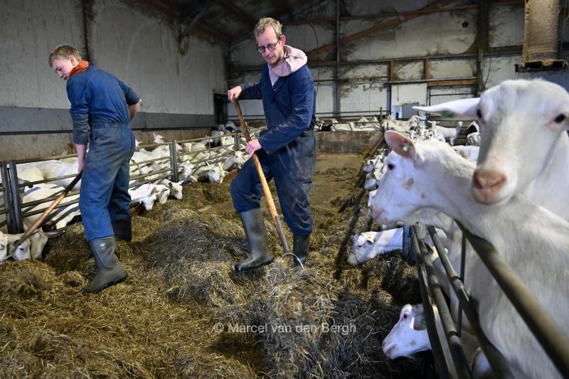 8-12-2025, Nederland, Horssen geitenhouderij Geitenhouder Niels van Middelkoop (r) en zijn stagiaire voeren de geiten. foto Marcel van den Bergh (niet voor Trouw, Parool, AD en NRC)