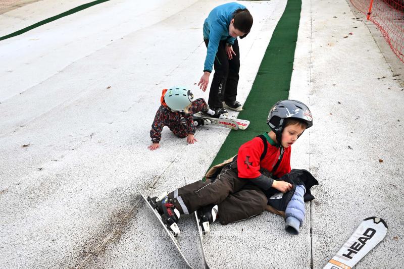 Tijdens de skiles op de Wijchense Berg probeert een jongetje tijdens de skiles na zijn afdaling zijn jas uit te doen.