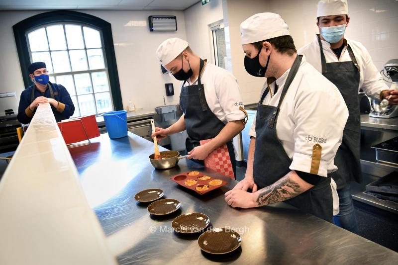 Leerlingen aan het werk in de keuken van het onderwijshotel tijdens coronacrisis. De docent kijkt toe.