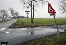11-2-2026, Nederland, De Glind Van oudsher worden er in jeugddorp De Glind om diverse redenen uithuisgeplaatste kinderen opgevangen in een gezinshuis. Een aangereden verkeersbord. (niet voor Trouw, Parool, AD en NRC)