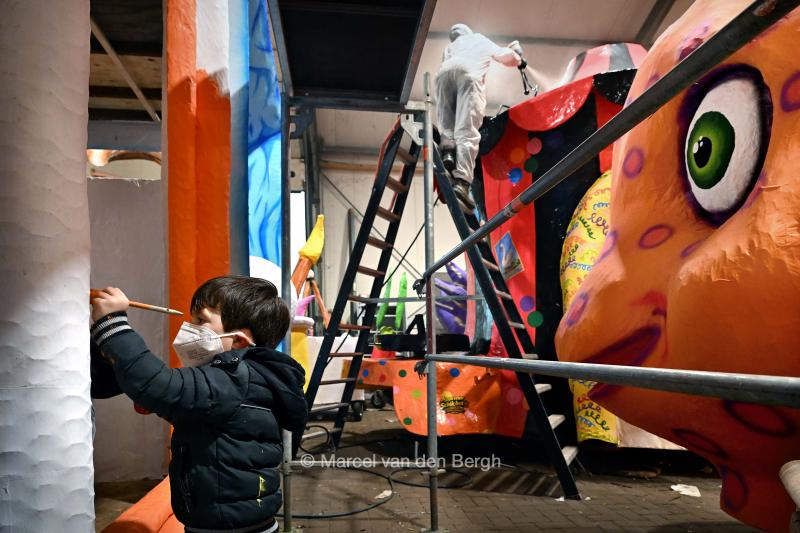 Op een bouwplaats wordt een laatste hand gelegd aan carnavalswagens.