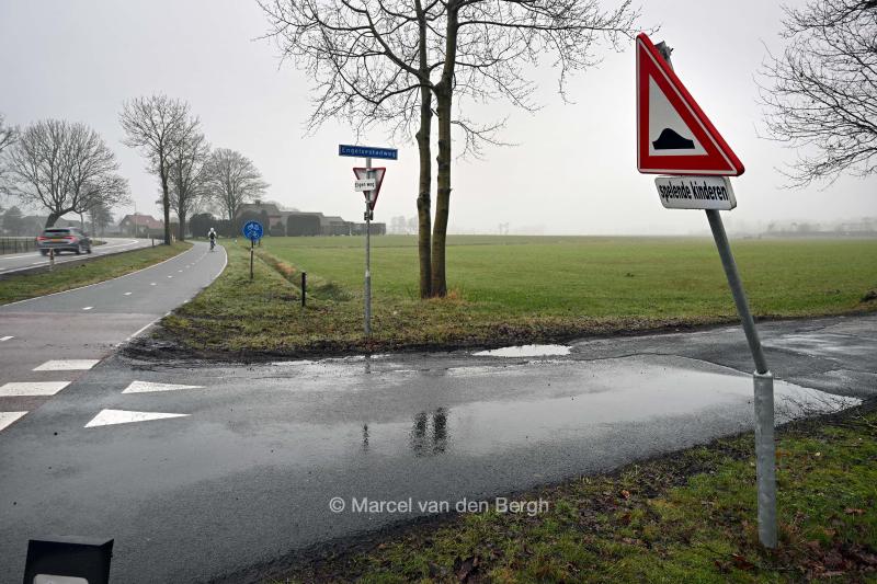 11-2-2026, Nederland, De Glind Van oudsher worden er in jeugddorp De Glind om diverse redenen uithuisgeplaatste kinderen opgevangen in een gezinshuis. Een aangereden verkeersbord. (niet voor Trouw, Parool, AD en NRC)