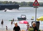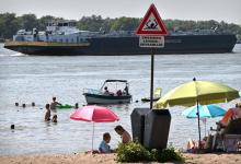 zwemmen; Merwede; rivier; grote rivier; gevaar; gevaarlijk; stroom; scheepvaart; zomer; zwemmer; rivierstrand; strand; strandje; schip; recreatie