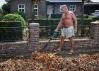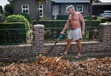 Vrij 22-10-2025, Nederland, Venhorst herfst Een man in blote bast blaast de herfstbladeren weg van zijn huis. foto Marcel van den Bergh (niet voor Trouw, Parool, AD en NRC)