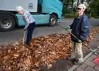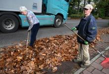Vrij 22-10-2025, Nederland, De Rips herfst 2 ouderen (80+) vegen de bladeren langs de weg zo bij elkaar dat de gemeente het de volgende dag gemakkelijk kan ophalen. foto Marcel van den Bergh (niet voor Trouw, Parool, AD en NRC)