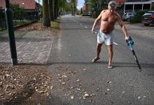 Vrij 22-10-2025, Nederland, Venhorst herfst Een man in blote bast blaast de herfstbladeren voor zijn huis weg van de straat. foto Marcel van den Bergh (niet voor Trouw, Parool, AD en NRC)