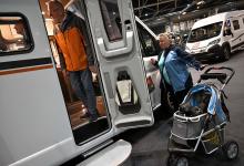 2-10-2025, Nederland, Utrecht Een echtpaar en hun hond bekijken een camper op de Kampeer & Caravan Jaarbeurs foto Marcel van den Bergh (niet voor Trouw, Parool, AD en NRC)