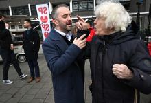 28-2-2026, Nederland, Rotterdam De SP probeert bij de Afrikaander Markt kiezers te interesseren voor de gemeenteraadsverkiezingen. Jimmy Dijk in discussie (niet voor Trouw, Parool, AD en NRC)