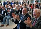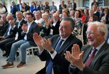 22-4-2026, Nederland, Maastricht Het Huis van de Democratie, het Gouvernementshuis, het provinciehuis van Limburg, bestaat 40 jaar en dat wordt gevierd in de feestzaal. Gouverneur Emile Roemer en oud gouverneur Sjeng Kremers klappen voor het panel. (niet voor Trouw, Parool, AD en NRC)