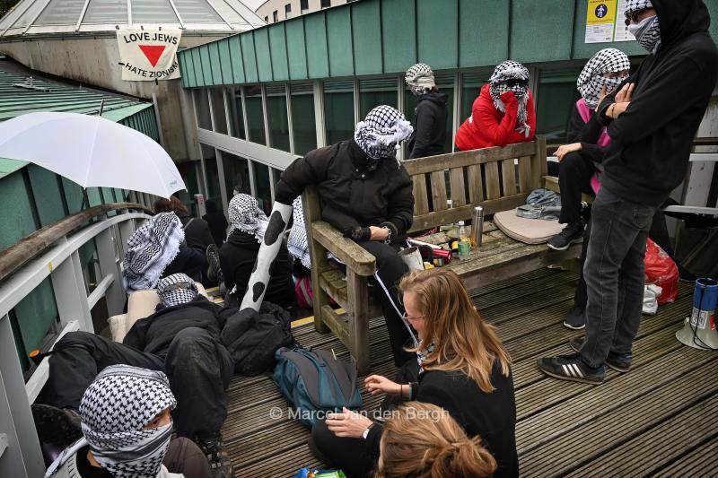 7-10-2025, Nederland, Nijmegen pro-Palestijnse demonstranten studenten bezetten het Goudsmitpaviljoen van de Radboud Universiteit. Sommigen zitten vastgeketend. foto Marcel van den Bergh (niet voor Trouw, Parool, AD en NRC)