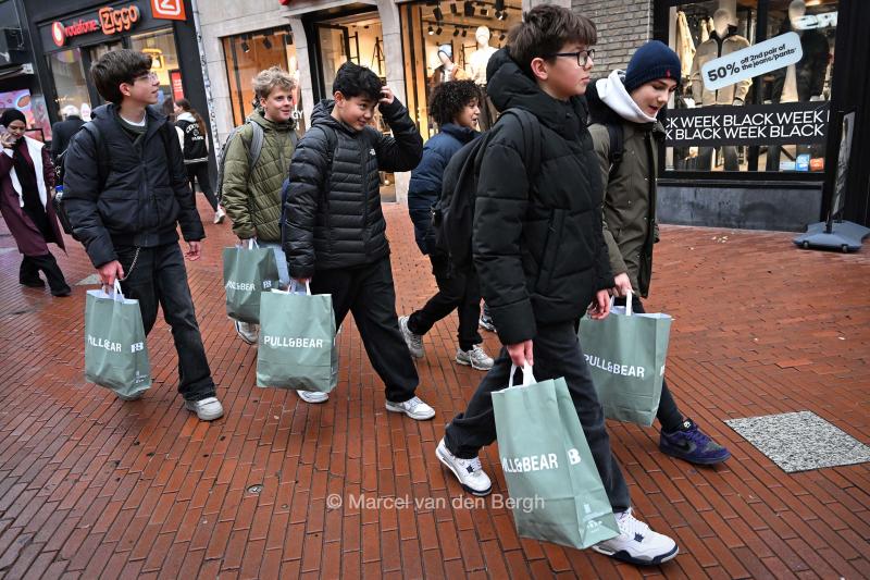 27-11-2025, Nederland, Eindhoven Black Friday zichtbaar in het winkelcentrum Een groep jongens heeft duidelijk dezelfde winkel aangedaan. foto Marcel van den Bergh (niet voor Trouw, Parool, AD en NRC)