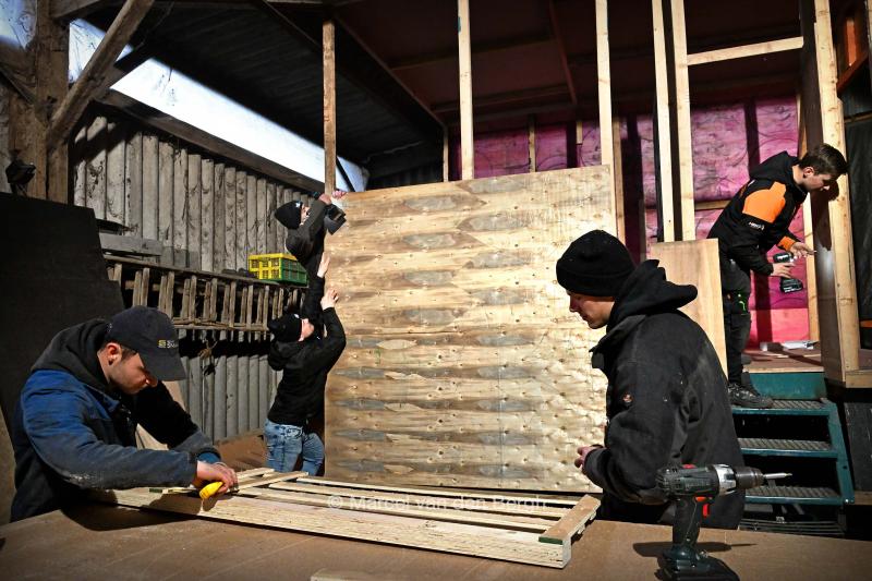 VRIJ 27-12-2025, Nederland, Maasbommel carnaval voorbereidingen carnaval In een boerenschuur bouwen jongeren aan een carnavalswagen. foto Marcel van den Bergh (niet voor Trouw, Parool, AD en NRC)