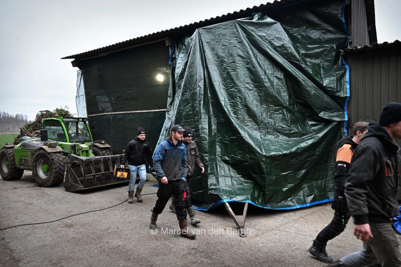 In een boerenschuur bouwen jongeren aan een carnavalswagen. De wagen is te groot voor de schuur en komt eronder uit.