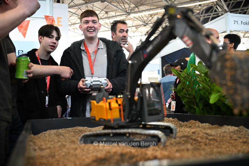 24-4-2026, Nederland, Amsterdam carrierebeurs in de Rai Jongeren bedienen een graafmachine met een controller. (niet voor Trouw, Parool, AD en NRC)