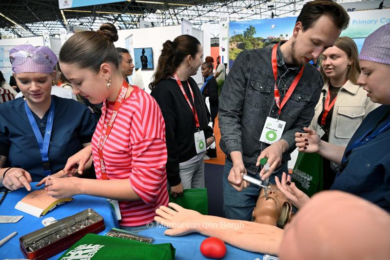 24-4-2026, Nederland, Amsterdam carrierebeurs in de Rai Ziekenhuis Amstelland probeert mensen te interesseren voor de zorg. Bezoekers kunnen leren een hechting te maken. (niet voor Trouw, Parool, AD en NRC)