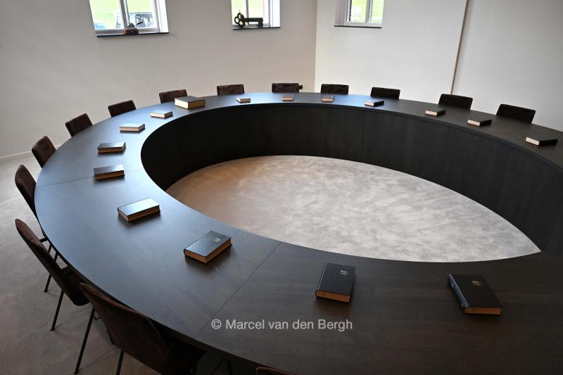 Een nieuwe kerk van de Gereformeerde Gemeente is klaar. De megakerk biedt plaats voor 1750 mensen. Bijbels liggen netjes in het Consistorie.