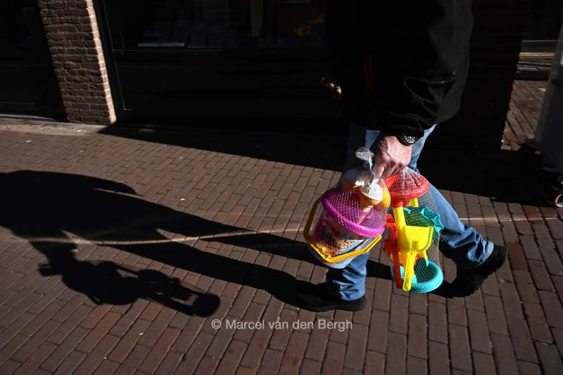 25-2-2026, Nederland, Oss mooi en warm weer in februari Een man heeft zandspeelgoed gekocht in het winkelcentrum. (niet voor Trouw, Parool, AD en NRC)