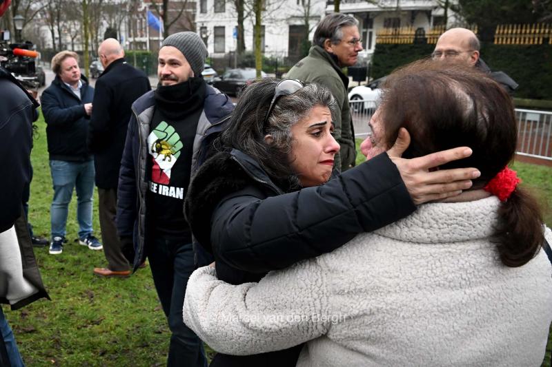 13-1-2026, Nederland, Den Haag Protest bij Iraanse ambassade tegen het geweld in Iran. Verdriet bij enkele deelnemers. foto Marcel van den Bergh (niet voor Trouw, Parool, AD en NRC)
