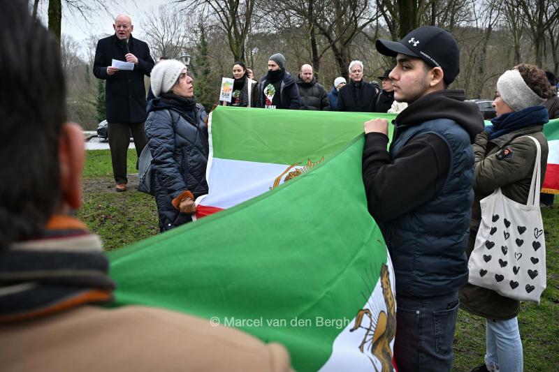 13-1-2026, Nederland, Den Haag Protest bij Iraanse ambassade tegen het geweld in Iran. Links oud-minister Uri Rosentahl spreekt de demonstranten toe. foto Marcel van den Bergh (niet voor Trouw, Parool, AD en NRC)
