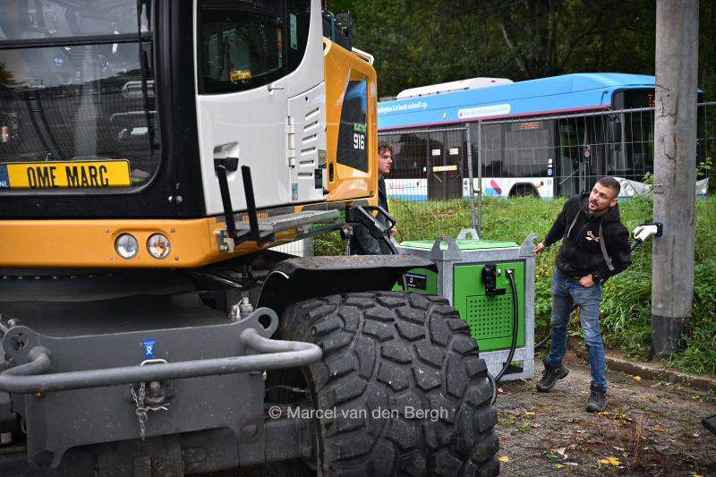 Trolley stroomleiding biedt oplossing als extra verlengsnoer omdat het stroomnet uit zijn voegen barst. Bouwmaterieel kan zo gemakkelijk aan stroom komen via een laadplek bij de trolleyleiding. Een graafmachine maakt er gebruik van. De machinist (Marc) sluit de stekker aan en checkt of de stroom loopt.