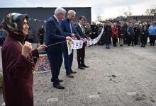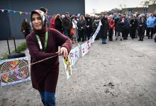 20-11-2025, Nederland, Dalfsen opening nieuw AZC Een lint met kindertekeningen wordt doorgeknipt. foto Marcel van den Bergh (niet voor Trouw, Parool, AD en NRC)