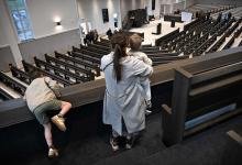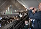 18-4-2026, Nederland, Kesteren Een nieuwe kerk van de Gereformeerde Gemeente is klaar. De megakerk biedt plaats voor 1750 mensen. Nieuwsgierigen kunnen een kijkje nemen tijdens een opendag. Een moeder en haar kinderen op het balkon. (niet voor Trouw, Parool, AD en NRC)