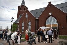 18-4-2026, Nederland, Kesteren Een nieuwe kerk van de Gereformeerde Gemeente is klaar. De megakerk biedt plaats voor 1750 mensen. Nieuwsgierigen kunnen een kijkje nemen tijdens een opendag. Belangstellenden staan in de rij om naar binnen te kunnen. (niet voor Trouw, Parool, AD en NRC)