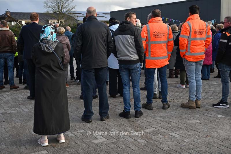 20-11-2025, Nederland, Dalfsen opening nieuw AZC Omwonenden en genodigden luisteren naar de toespraken. Een asielzoekster luistert mee. foto Marcel van den Bergh (niet voor Trouw, Parool, AD en NRC)