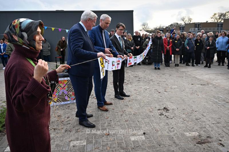 20-11-2025, Nederland, Dalfsen opening nieuw AZC Een lint met kindertekeningen wordt doorgeknipt. foto Marcel van den Bergh (niet voor Trouw, Parool, AD en NRC)