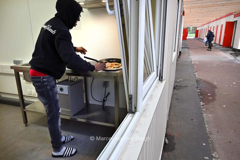19-11-2025, Nederland, Biddinghuizen tijdelijk aanmeldcentrum AZC op evenemententerrein ter ontlasting van Ter Apel Een jongen maakt zijn eten klaar. foto Marcel van den Bergh (niet voor Trouw, Parool, AD en NRC)