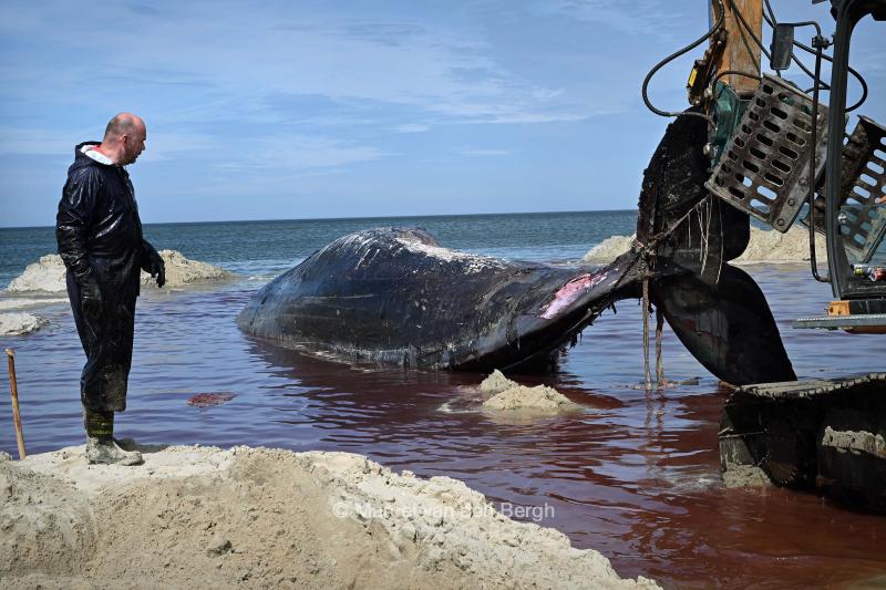 15-4-2026, Nederland, Renesse De KNRM probeert een dode potvis bij vloed iets meer het strand op te trekken zodat hij gemakkelijker kan worden ontleed. (niet voor Trouw, Parool, AD en NRC)