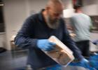 VRIJ 14-10-2025, Nederland, Rotterdam Johan Muurlink de boterhammenman smeert elke dag in de vroege ochtend boterhammen voor kinderen die zonder ontbijt naar school gaan. Een vrijwilliger komt de bakfiets met brood ophalen waarmee hij scholen affietst. foto Marcel van den Bergh (niet voor Trouw, Parool, AD en NRC)