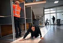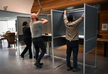 28-10-2025, Nederland, Druten Medewerkers van de gemeente bouwen stembureau's op. stembureau Mamre foto Marcel van den Bergh (niet voor Trouw, Parool, AD en NRC)