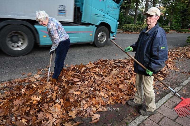 Vrij 22-10-2025, Nederland, De Rips herfst 2 ouderen (80+) vegen de bladeren langs de weg zo bij elkaar dat de gemeente het de volgende dag gemakkelijk kan ophalen. foto Marcel van den Bergh (niet voor Trouw, Parool, AD en NRC)