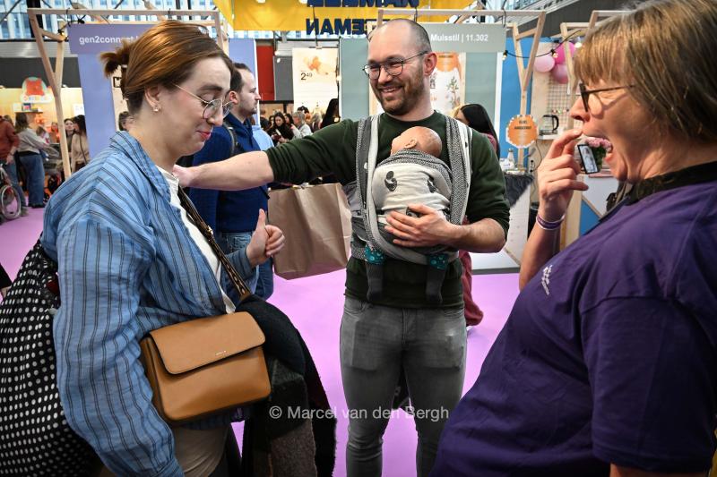 19-2-2026, Nederland, Amsterdam Negenmaandenbeurs in de Rai Aanstaande ouders testen een draagzak met een pop. De man maakt een grap. De aanstaande moederr steekt haar duim op. (niet voor Trouw, Parool, AD en NRC)