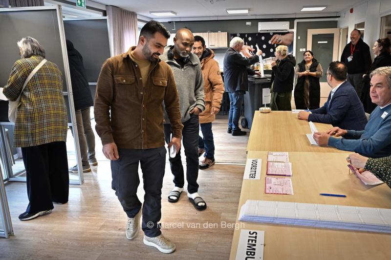 Ossenaren brengen hun stem uit bij de vluchtelingenopvang. Geinteresseerde vluchtelingen van de opvang nemen een kijkje op het stembureau en krijgen uitleg.