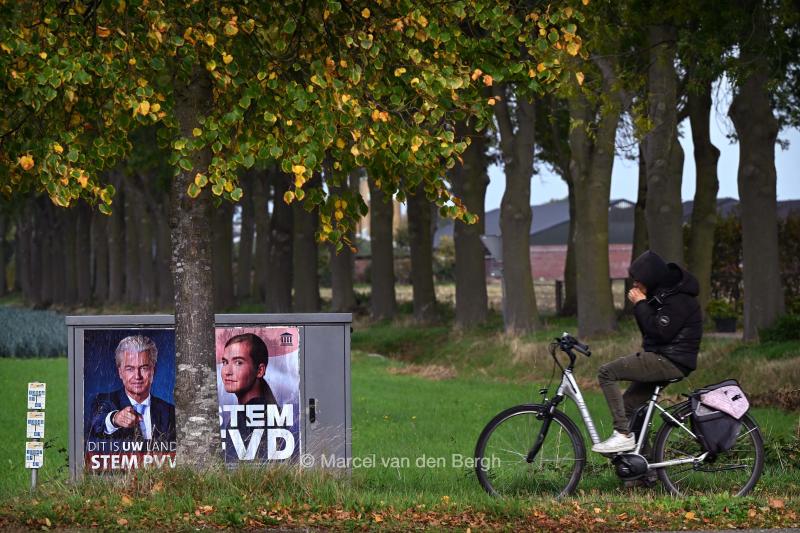 22-10-2025, Nederland, Schaijk verrechtsing in het straatbeeld zichtbaar aan verkiezingsborden affiche van FVD naast een affche van de PVV op het platteland foto Marcel van den Bergh (niet voor Trouw, Parool, AD en NRC)