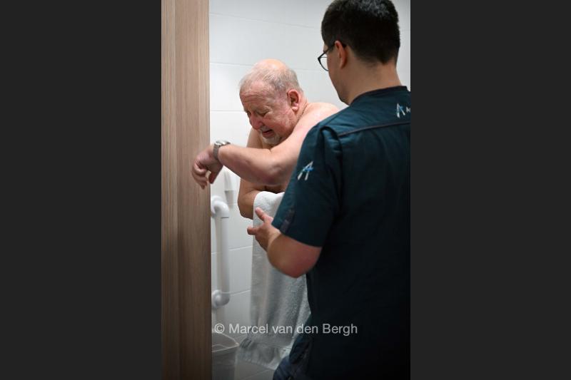 28-10-2025, Nederland, Etten-leur Wijkzorg aan het werk in de wijk. Een oudere man wordt geholpen bij het douchen. foto Marcel van den Bergh (niet voor Trouw, Parool, AD en NRC)
