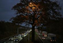 10-11-2025, Nederland, Ulvenhout Verkeersdrukte op de A58 in de ochtendspits ter hoogte van de eik in de middenberm. foto Marcel van den Bergh (niet voor Trouw, Parool, AD en NRC)
