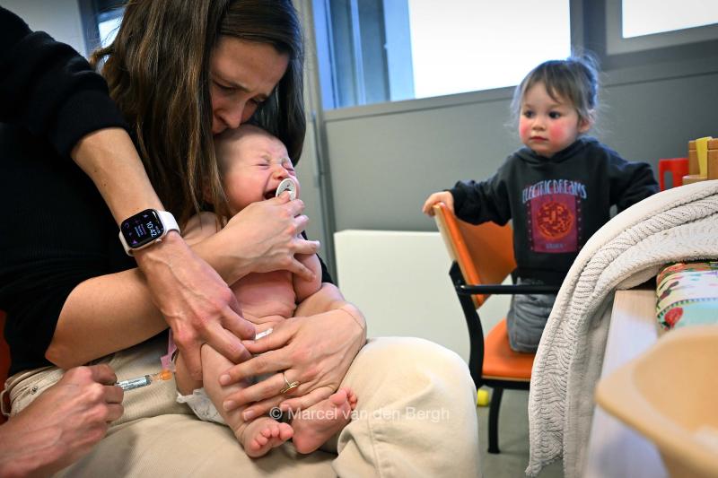 Moeder bezoekt met haar 3 maanden oude baby (jongetje) het consultatiebureau voor diverse vaccinaties. Haar iets oudere dochtertje mocht mee.