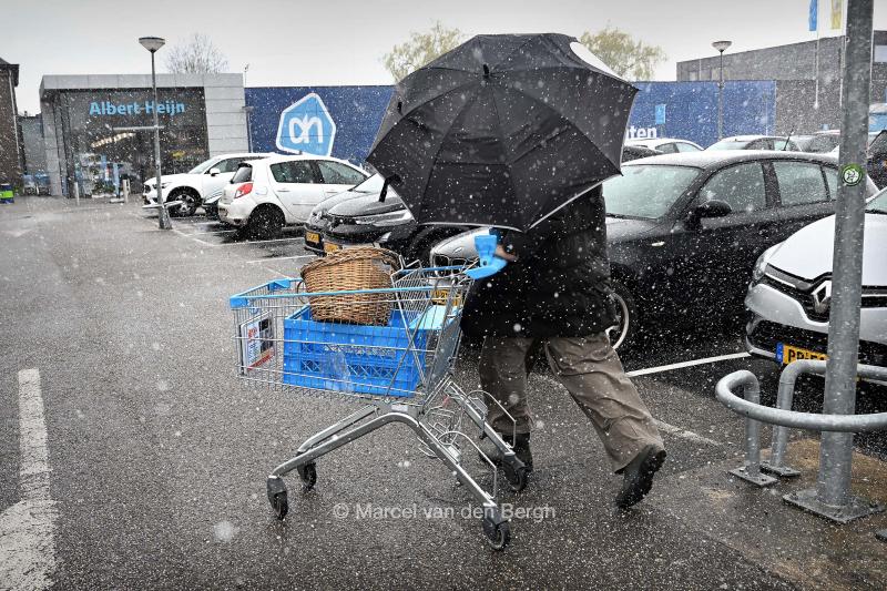 VRIJ 26-3-2026, Nederland, Druten Maart roert zijn staart. Het sneeuwt terwijl iemand boodschappen gaat doen bij de Albert Heijn. (niet voor Trouw, Parool, AD en NRC)