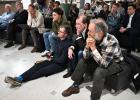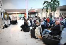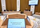 30-3-2026, Nederland, Gorinchem Raadsvergadering met stemming over herstemming gemeenteraadsverkiezingen. Er zou gefraudeerd zijn met volmachtstemmen. Burgers volgen de raadsvergadering via een scherm in de hal van het stadhuis. (niet voor Trouw, Parool, AD en NRC)