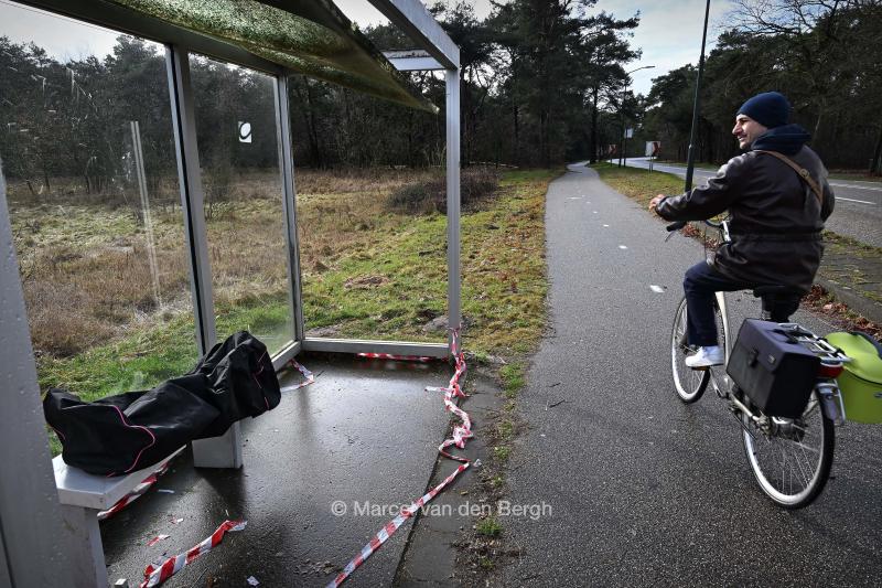 17-2-2026, Nederland, Budel Bij het AZC Budel stopt geen bus meer vanwege aanhoudende overlast. De verwaarloosde bushalte staat er nog. (niet voor Trouw, Parool, AD en NRC)