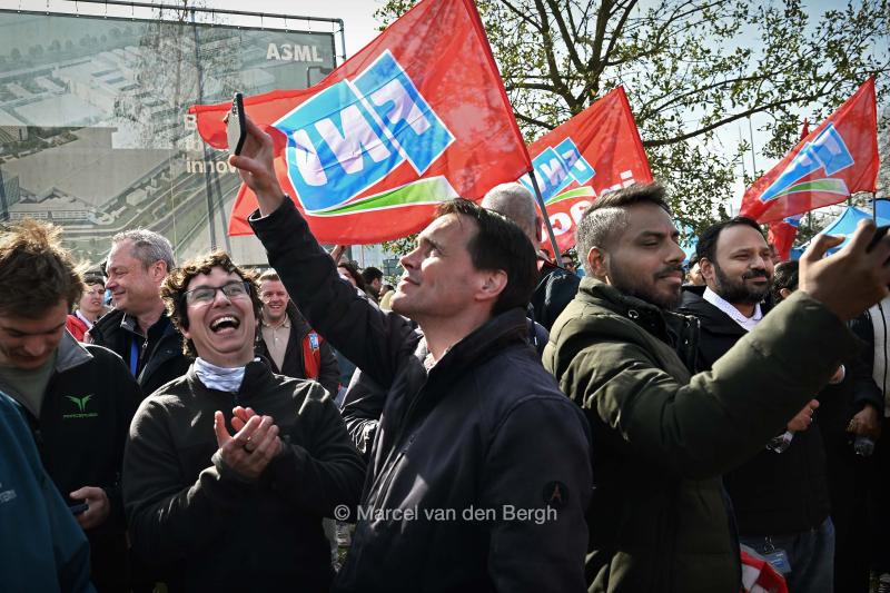 24-3-2026, Nederland, Veldhoven Protestactie werknemers chipmachinefabrikant ASML tegen geplande ontslagen. Een werknemer fotografeert de drukte. (niet voor Trouw, Parool, AD en NRC)