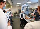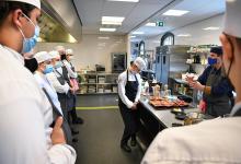 1-3-2021, Nederland, Breda horeca opleiding MBO De Rooi Pannen Leerlingen aan het werk in de keuken van het onderwijshotel tijdens coronacrisis. De docent legt uit. coronavirus; virus; corona; pandemie; ziekte; RIVM; sociale onthouding; coronacrisis; COVID-19; anderhalvemetersamenleving; anderhalvemetermaatschappij; social distance; social distancing; MBO; horeca; onderwijshotel; onderwijs; school; Middelbaar Beroepsonderwijs; leerlingen; leerling; kok; keuken; foto Marcel van den Bergh