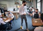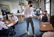 1-3-2021, Nederland, Breda horeca opleiding MBO De Rooi Pannen Leerlingen aan het werk in de keuken van het onderwijshotel tijdens coronacrisis. Omdat er geen gasten in het hotel zijn ivm de coronacrisis, eten de leerlingen zelf hun gerechten op. De leerling bediening doet zijn werk. coronavirus; virus; corona; pandemie; ziekte; RIVM; sociale onthouding; coronacrisis; COVID-19; anderhalvemetersamenleving; anderhalvemetermaatschappij; social distance; social distancing; MBO; horeca; onderwijshotel; onderwijs; school; Middelbaar Beroepsonderwijs; leerlingen; leerling; kok; keuken; foto Marcel van den Bergh