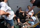 14-6-2025, Duitsland, Hanau kastenlauf De kastenlauf is een hardloopwedstrijd over 5 kilometer waarbij 2 deelnemers samen een krat bier tillen. De inhoud hiervan wordt gedronken gedurende de race en moet op zijn voordat de deelnemers over de finish gaan. Uitgeputte deelnemers na de finish. foto Marcel van den Bergh (niet voor Trouw, Parool, AD en NRC)