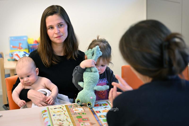 Moeder bezoekt met haar 3 maanden oude baby (jongetje) het consultatiebureau voor diverse vaccinaties. Haar iets oudere dochtertje mocht mee.