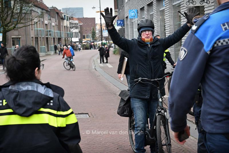 Een man houdt bij wijze van grap zijn handen omhoog als hij de politie en handhaving tegenkomt.